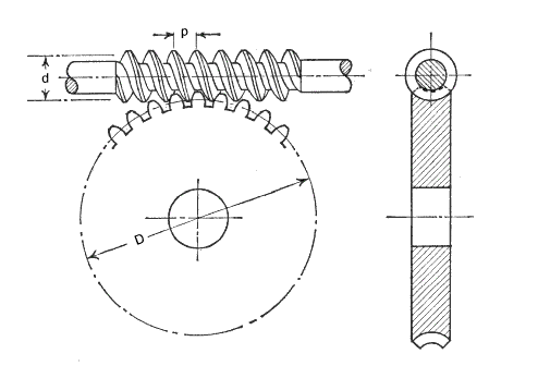 當(dāng)不相交的交叉軸之間需要:大的減速比時(shí),使用蝸輪??梢允褂没镜男饼X輪,但可以傳遞的功率很低。蝸桿傳動(dòng)裝置由一個(gè)大直徑的蝸輪和一個(gè)與蝸輪圓周上的齒嚙合的蝸桿組成。蝸桿類(lèi)似于螺釘,蝸輪類(lèi)似于螺母的一部分。當(dāng)蝸桿旋轉(zhuǎn)時(shí),蝸輪由于蝸桿的類(lèi)似螺桿的作用而旋轉(zhuǎn)。蝸輪組的尺寸一般以蝸桿與蝸輪的中心距為基準(zhǔn)。